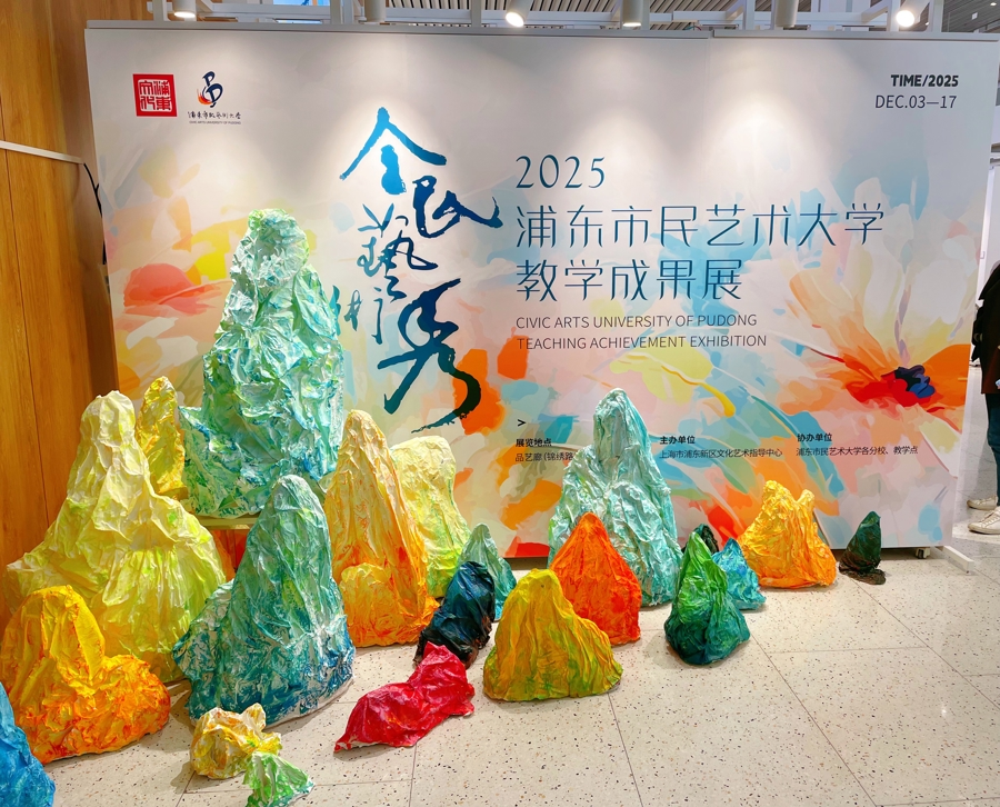 活动现场,浦东市民艺术大学的老师和学员们以及参展观众们齐聚一堂,共同见证一场融合学习成果与艺术创作的视觉盛宴。引人注目的是,师生们利用废旧报纸共同创作的艺术装置《千里江山图》,以环保再生的理念诠释传统经典,生动体现了艺术普及与生态意识的巧妙结合。